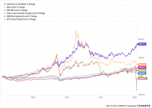 The price of gold during the past 20 years has beaten silver, the major U.S. stock indexes and oil soundly with a climb of 536.1%. Silver is next with a surge of 202.1%, as the following chart shows.