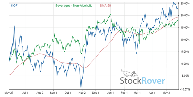 The one-year returns for Coca-Cola Femsa show a 23.3% increase in stock price — the chart below shows these returns after adjusting for dividend growth. Plotted in the same chart are also a 50-day moving average for KOF and the industry dividend-adjusted growth over the same period.