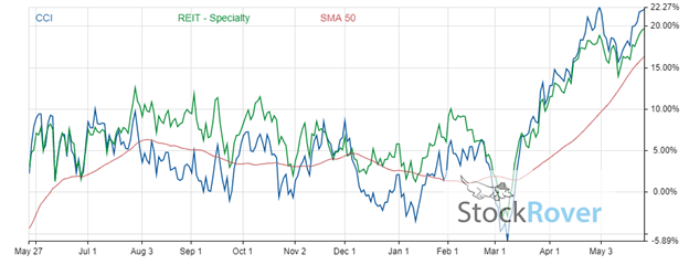 A quick look at the trends in the last year show that while CCI’s growth has been stellar, it mirrors the specialty REIT industry almost exactly. While this likely points to a low beta for the stock and decreased volatility, it also diminishes the likelihood of “sky-high” returns by Crown Castle International.
