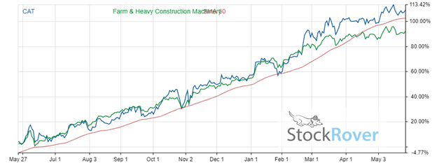 The company has grown at an almost constant rate in the trailing 12-month period, totaling returns of 108.9%. The dividend adjusted returns are plotted with a 50-day moving average and the industry average for heavy construction machinery.