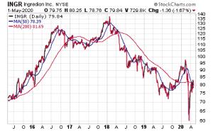 A second stock Kramer said she likes is Ingredion (NYSE:INGR), a Chicago-area global provider of ingredients to customers in more than 120 countries that produced 2019 sales of $6 billion. The company uses grains, fruits, vegetables and other plant-based materials as ingredients for food, beverages, animal nutrition, brewing and other products.