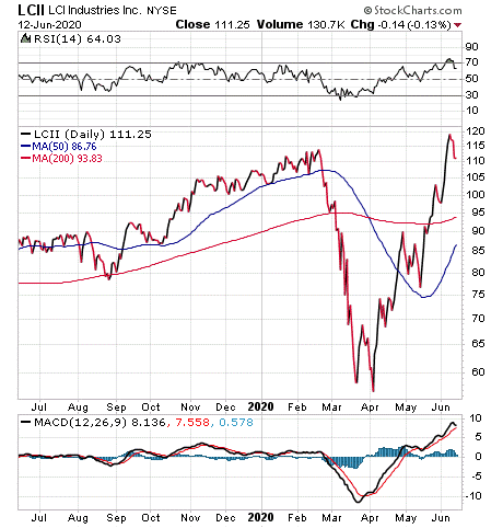A “better bet at this point” is on the key component suppliers to all the RV companies: Patrick Industries (NASDAQ:PATK) and LCI Industries (NYSE:LCII), both of Elkhart, Indiana, said Carlson, who also leads the Retirement Watch advisory service. Both pay dividends, with Patrick Industries providing a current yield of 1.90%, while LCI Industries is offering 2.33%.