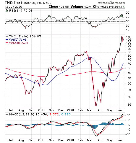 Thor Industries, recommended by the Fast Money Alert trading service led by Jim Woods and Mark Skousen, PhD, also has a strong backlog of orders that consists of $857.9 million for its North American towable products, $548.0 million for its North American motorized vehicles and $803.5 million for its European RVs. Bob Martin, chief executive officer of Thor Industries, issued a statement indicating every North American dealer he has spoken to in recent weeks expressed excitement about the sales pace of RVs.