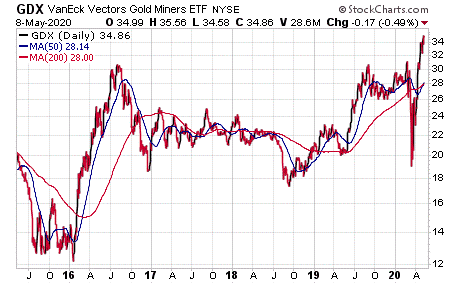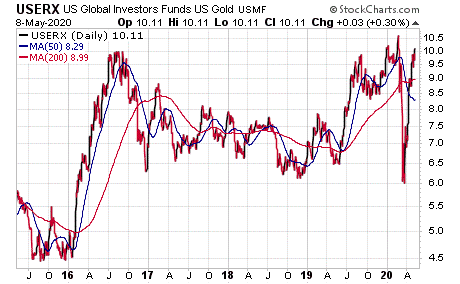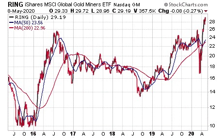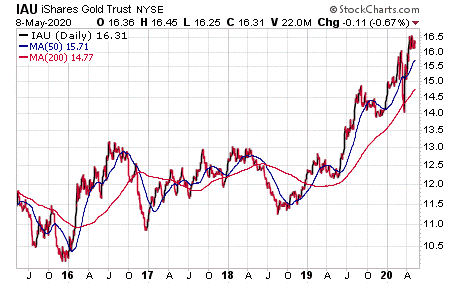 Jim Woods, who heads the Successful Investing and Bullseye Stock Trader advisory services, said one of his most promising gold investments is iShares MSCI Global Gold Miners ETF (NASDAQ:RING), offering a current dividend yield of 0.68%. The ETF is recommended by Successful Investing, which uses a proprietary market-timing strategy that now shows a “buy” signal for gold. However, the indicator is warning to hold back from buying domestic and international equities in the wake of the market’s 30%-plus crash in March.