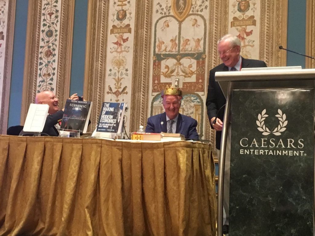 Mark Skousen, PhD, in the middle, receives the “Triple Crown of Economics” from media mogul Steve Forbes. Skousen leads premium investment services that include Home Run Trader, Five Star Trader, TNT Trader and Fast Money Alert.