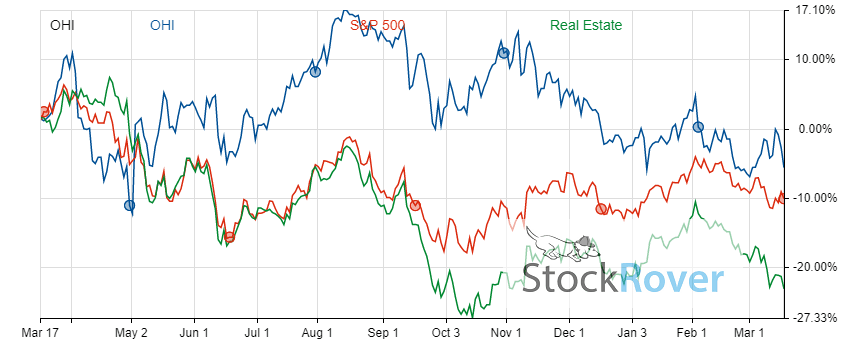 Omega Healthcare Investors has mostly followed the S&P 500 in its recent growth patterns. The company has dropped 5.7% in the trailing 12 month period.
