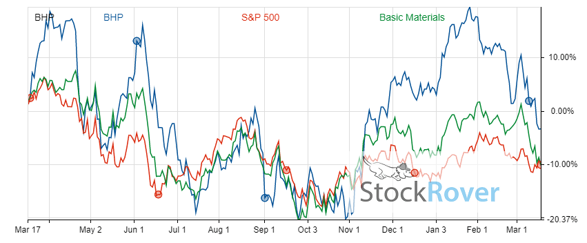 However, this high dividend yield is partially inflated by a dropping share price in the last few months. In the trailing 1-year period, BHP has returned 4.6%, but the company has dropped nearly 5% in the last year. Investors can make their own decisions regarding whether this is an ill omen for the company or an ideal buying opportunity.