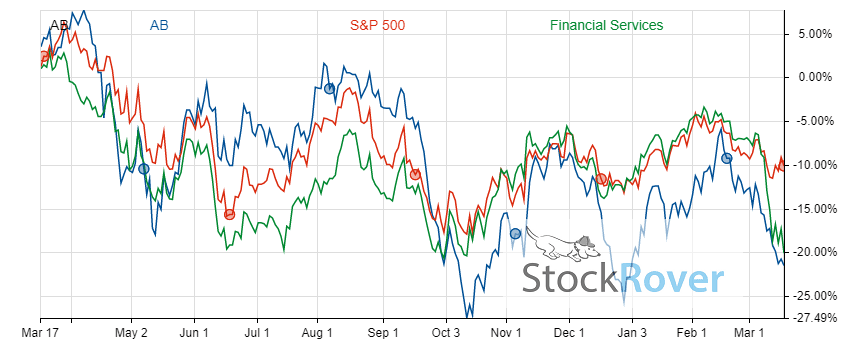 The company’s share price has sharply increased in the trailing three year period, but dropped meaningfully since 2022. Shares of AB have dropped 18.4% in the last 12 months, but increased 139.3% in the last 36 months.