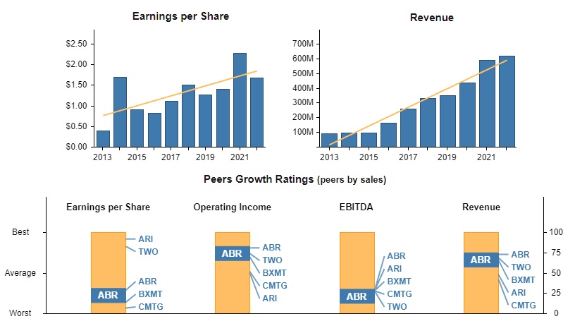In 2023, ABR ranks in the top 27 percent for expected earnings per share (EPS) growth and the top 14 percent for its intangible assets and equity growth. Its operating income surpasses that of 81 percent of its competitors, and the company has show steady revenue growth throughout the last 10 years.