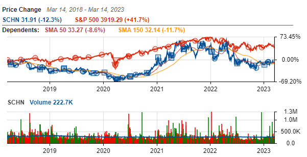Rather than occurring in a single spike, the growth of SCHN stock has been gradual and consistent in the last 3 years. This followed a downturn in the 2 years before and precedes a current dip in share price. Plotted below is both a comparison of its fluctuation with the S&P 500 as well as its regular trading volume.