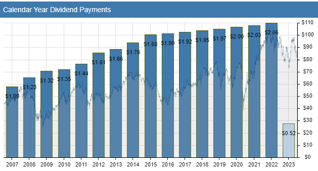 The fund supplements its capital appreciation with consistent semiannual dividend payments. IEMG currently pays a dividend of $066 per share and paid a total annual dividend of $1.26 for the year 2022 — giving it a trailing dividend yield of 2.7% with a forward yield to match.