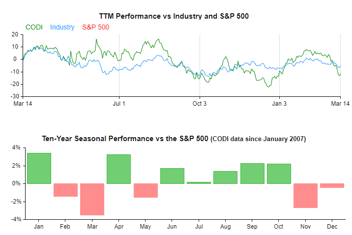 Compass Diversified Holdings is a strong investment largely for its momentum patterns. The company is in the 49th percentile overall when compared to other stocks based on momentum, but CODI excels when we note the strong industry momentum and 5-year analysis of its simple moving average. The performance of the company versus the industry and the S&P500 are shown below.