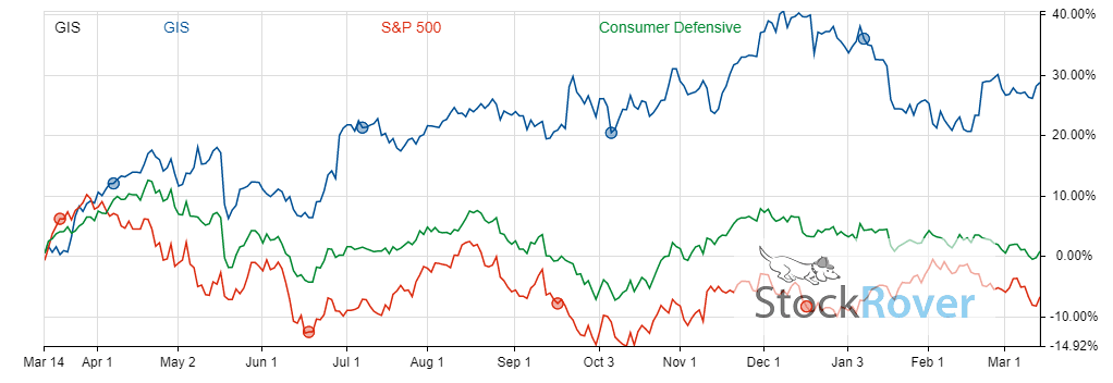 The company’s returns have been remarkably stable in the trailing 12-month period, having grown a healthy 31.7% since March 2022. General Mills significantly outperformed its competitors in the consumer defensive industry. Although it undershot the S&P 500, GIS’s returns were considerably more level throughout the year than the index. The company weathered economic challenges deftly throughout the last 3 years — General Mills was quick to recover from brief market recessions. The company’s dividend-adjusted returns for the past year are plotted below: