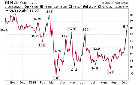 Income investors will like Olin’s dividend yield of 5.20%. Its share price has risen by 34.12% during the past month and 47.58% for the last three months, but fallen 7.42% so far this year and 7.81% for the past 12 months.