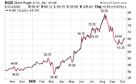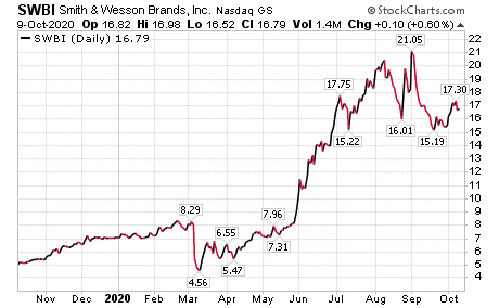 Bryan Perry, who leads the Cash Machine investment newsletter and the Premium Income, Quick Income Trader, Breakout Profits Alert and Hi-Tech Trader advisory services, told me he likes Smith & Wesson Brands Inc. (NASDAQ:SWBI), a Springfield, Massachusetts-based manufacturer of firearms and ammunition, along with Sturm Ruger & Co. (NYSE:RGR), a Southport, Connecticut, gun maker. The latter company provides firearms for hunting, target practice and home protection.