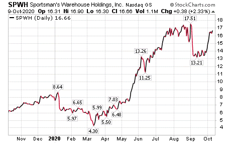 Sportsman’s Warehouse is another pre-dividend stock that is using its capital to grow quickly at this time rather than provide regular cash disbursements to its shareholders. The strategy is paying off right now as the stock has soared 22.91% in the past month, 17.49% in the last three months and 107.47% so far this year.