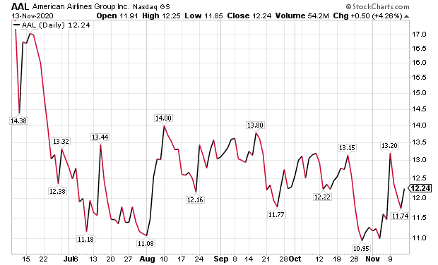 Each of those airline stocks jumped on Nov. 9, when Pfizer announced encouraging preliminary vaccine trial data, with Delta climbing 16.99%, Southwest soaring 9.70%, United rising 19.15%, American ascending 14.98% and JetBlue jumping 21.7%. The momentum faded the next day when Delta nosed up 0.73%, Southwest gained 2.07%, United fell 3.07%, American dropped 6.21% and JetBlue dipped 0.60%.
