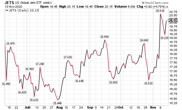 “They’ve laid off thousands of pilots and while the planes are [often] full now, they’re only flying 30% as much as they were a year ago. Even after the pandemic ends, it’s going to take time to rebuild demand and capacity alike. Buy JETS now if you like and come back in a few years. We’ll talk again when 2022 rolls around.”