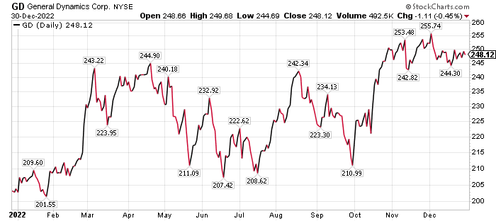 BofA set a price objective of $325 on General Dynamics, noting it faces risks. On the defense side of its business, the risks include possible poor execution on defense programs hurting margins and any U.S. Defense Department budget cutting medium- and long-term growth. General Dynamics rose 21.40% in 2022.