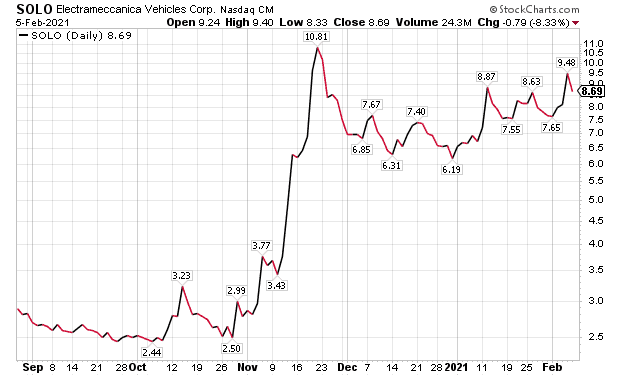 Bryan Perry, who recommended SOLO in his Hi-Tech Trader service on Jan. 15, watched the stock rise 5.81% through the close of trading on Feb. 2. Based on pure EV sector momentum, he has a target on the stock’s share price of $12, projecting a 58.52% gain from his buy price.