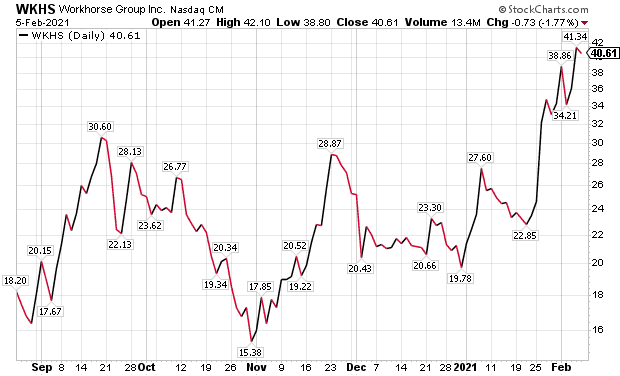 Workhorse (NASDAQ: WKHS), of Cincinnati, Ohio, is focused on manufacturing electrically powered delivery and utility vehicles. It is angling to win a U.S. Postal Service contract worth up to $6.3 billion to provide delivery trucks.