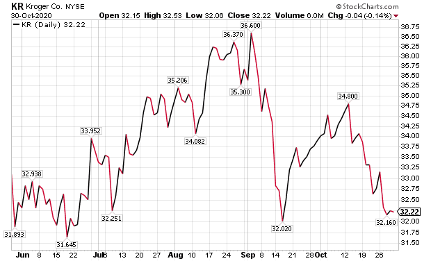 Kroger offers a dividend yield of 2.23% and it trades a 12.21 price-to-earnings (P/E) ratio. Its stock also has fallen in price recently, so investors may want to consider buying shares in Kroger if the upcoming Nov. 3 presidential election produces a clear winner.