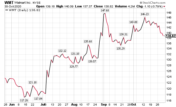 It operates 11,500 stores worldwide spread across 27 countries and e-commerce sites. The company also is growing its online sales and recently announced plans to invest in the TikTok video-sharing application. Walmart’s stock price has risen 7.64% during the past three months, 18.12% so far this year and 20.16% for the past year.