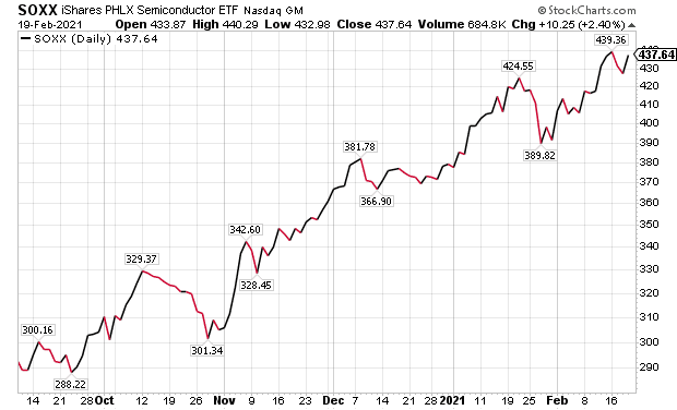 The semiconductor sector has moved significantly higher of late, said Jim Woods, editor of Successful Investing, Intelligence Report and Bullseye Stock Trader. The benchmark exchange-traded fund (ETF) in the space is the iShares PHLX Semiconductor ETF (SOXX). This fund is up some 28% over the past three months.