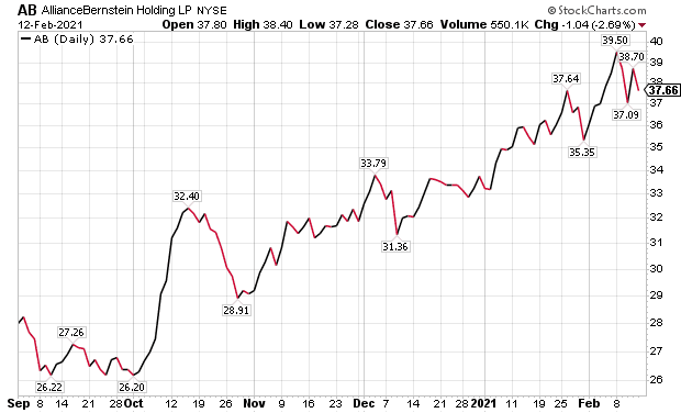 One seasoned Wall Street trader who has recommended investing in AllianceBernstein three times since 2013 is Bryan Perry, who writes a monthly newsletter called Cash Machine that features dividend-paying equities. On each occasion, he included the AllianceBernstein purchases in Cash Machine‘s Accelerated Income portfolio.