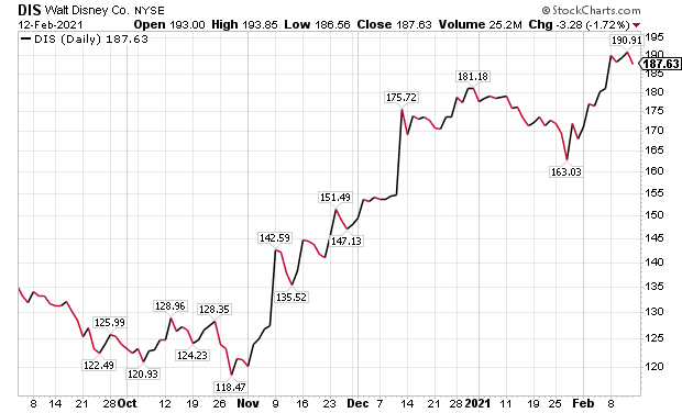 Jessica Reif Ehrlich, a seasoned media and entertainment analyst with BoA Global Research, recently wrote positively about Disney in a Feb. 12 research note and predicted brighter days ahead for the company with gradual increases in the percentage of capacity allowed at its theme parks and hotels. The company’s latest quarterly earnings results reported on Feb. 11 led to an increase in her price objective on Disney to $223, up from $192. Her “buy” rating on the stock remains, as she highlighted “robust” Disney+, Hulu and ESPN+ streaming services.