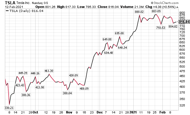 Despite Tesla’s towering 12-month P/E ratio of 171.13, compared to the domestic automotive industry’s 16.94, the company has been enticing new shareholders willing to pay the rocketing price. Tesla’s Chief Executive Officer Elon Musk attracted major news coverage on Feb. 8 when he announced his company is investing $1.5 billion in Bitcoin and will accept the cryptocurrency as payment for its vehicles. Tesla needs to outperform its rivals in share price gains, since it does not pay a dividend, in contrast to the average dividend yield of 0.7% for the industry and 1.6% for the S&P 500, according to StockRover.