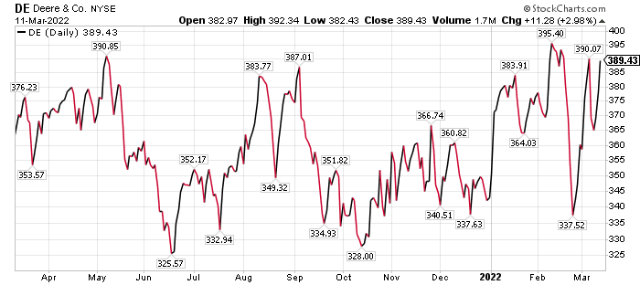 The prospect that additional farm equipment may be needed to fill any supply void left by Russia and the Ukraine adds to Deere’s appeal, Perry told me. Perry, who leads the Cash Machine investment newsletter, as well as the Premium Income, Quick Income Trader, Breakout Options Alert and Hi-Tech Trader services, is a Wall Street veteran.