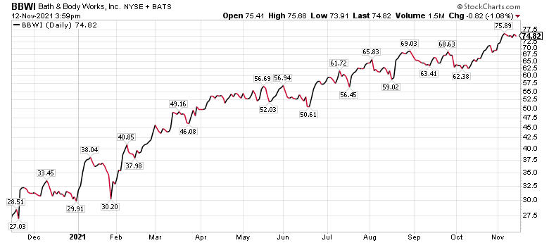 BBWI received a “Buy” recommendation and a $90 price objective from BofA. The investment firm described Bath & Body Works as one of the best positioned retailers for the holiday season and in 2022.