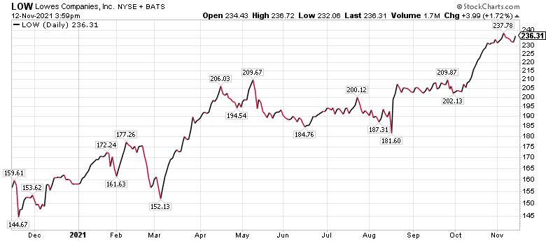 Seasoned stock picker Jim Woods, leader of the Intelligence Report and Successful Investing newsletters, as well as the Bullseye Stock Trader advisory service, includes Mooresville, North Carolina-based Lowe’s among the recommendations in his Intelligence Report Income Multipliers portfolio. The stock has been a profitable pick for his subscribers.