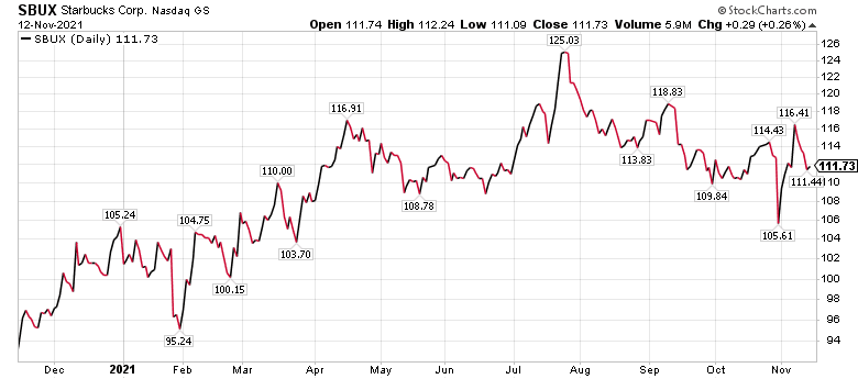 “We believe SBUX is positioned to benefit from increased interest in gift cards as it leverages digital and out-of-store channels and creates a promotional presence in the drive-through lanes that, along with Mobile Order & Pay, account for 70% of transactions,” BofA wrote. “While Starbucks faces supply-chain pressures, it has added new manufacturing and supply partners and is seeing inventory constraints ease in key categories.”
