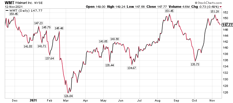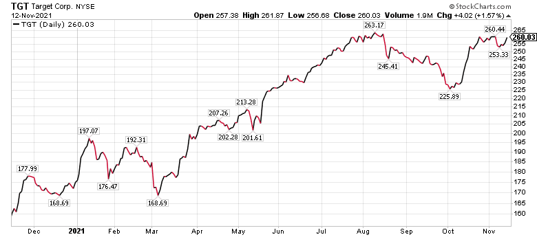BofA’s two top choices in the discount retail sector are Walmart and Target (NYSE: TGT) due to their strong inventory positions, favorable port access, long-term container shipping agreements and chartered vessel capacity, according to BofA. Both WMT and TGT, while not immune to the challenging supply chain and rising cost environment, are well positioned relative to the broader competitive retail landscape going into the holidays, the investment firm concluded.