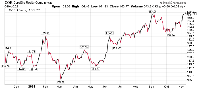 ISI Evercore added Denver’s CoreSite Realty Corporation (COR) as a fourth data center stock that it included in its new coverage but rated it as an “in line” prospect, not one of the sector’s three stocks that it predicts will “outperform” the market. CoreSite Realty appears “fairly valued” at current levels with a target price of $154, the investment firm wrote. However, CoreSite offers a 3.3% dividend yield that gives the stock extra appeal to dividend investors.