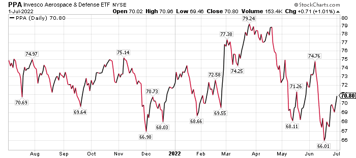 The fund is down 2.46% in the past month, 10.11% over the last three months, 2.44% for the year to date and 5.97% over the previous 12 months. However, PPA has outperformed the market and is up 3.87% in the last week.