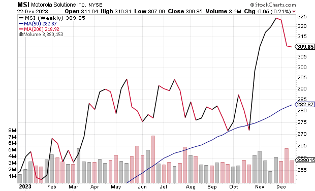 Motorola trades at 25 times the forward-year (2024) earnings per share (EPS) estimate, which is a premium to its 21 times February 2020 pre-pandemic multiple and a slight discount to its November 2021 peak multiple of 27 times, DiPalma assessed. Record demand for public safety communications, video security and command center software should drive long-term EPS growth in the low double-digit percentages when taking into account organic growth, acquisitions and stock buybacks, he added.