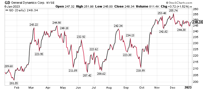 BofA set a price objective of $325 on General Dynamics, noting it faces risks. On the defense side of its business, the risks include possible poor execution on defense programs hurting margins and any U.S. Defense Department budget cutting medium- and long-term growth. General Dynamics rose 21.40% in 2022 but BofA expects further gains in 2023.