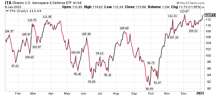 ITA follows the Dow Jones U.S. Select Aerospace & Defense Index. It top holdings recently were Raytheon, Lockheed Martin, Boeing (NYSE: BA), TransDigm (NYSE: TDG) and Northrop Grumman. It held 35 stocks, and the top 10 holdings of the ETF comprised 75% of the portfolio. The ETF also attained an 8.85% return during the past 12 months and a 19.17% jump in the past three months.