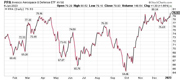 PPA follows the SPADE Defense Index. Recently, the fund held 56 stocks, and its top holdings were Boeing, Raytheon, Lockheed Martin (NYSE: LMT), Northrop Grumman (NYSE: NOC) and General Dynamics. Its 10 largest positions were 56% of the ETF. The ETF is up 10.03% in the last year, as well as 17.47% for the past three months.