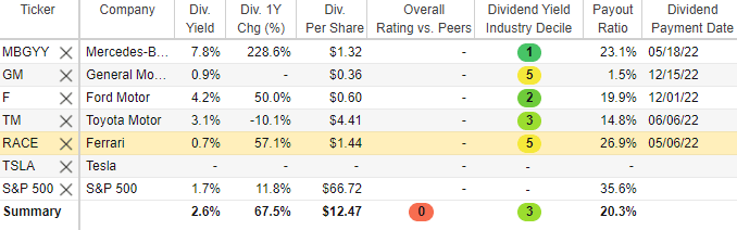The five electric vehicle income stocks to consider trade at much lower price-to-earnings (P/E) ratios than Tesla, while offering a chance for capital appreciation due to increases in their respective share prices and dividends that enhance total return. Tesla’s 58.75 price-to-earnings ratio is far more than that of the dividend-paying legacy electric vehicle (EV) stocks like Stuttgart, Germany-based Mercedes-Benz Group AG (OTC: MBGYY), 5.89; Detroit-based General Motors (NYSE: GM), 6.99; Dearborn, Michigan-based Ford Motor Co. (F), 6.45; Toyota City, Japan-based Toyota Motor Corporation (NYSE: TM), 11.55; and Maranello, Italy-based Ferrari N.V. (NYSE: RACE) 42.86.