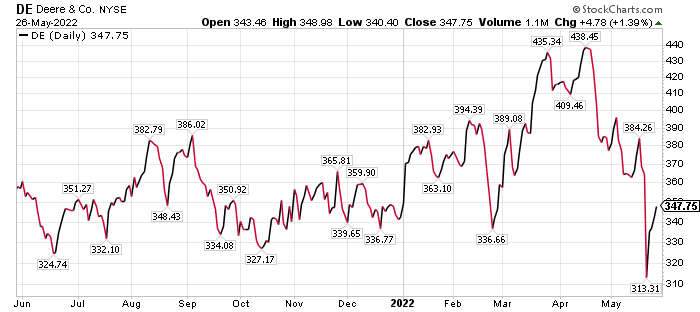 Deere has fallen back since its recent high on April 20, so investors should be able to purchase shares at reduced prices, Connell continued. It already has been rebounding in the past week.