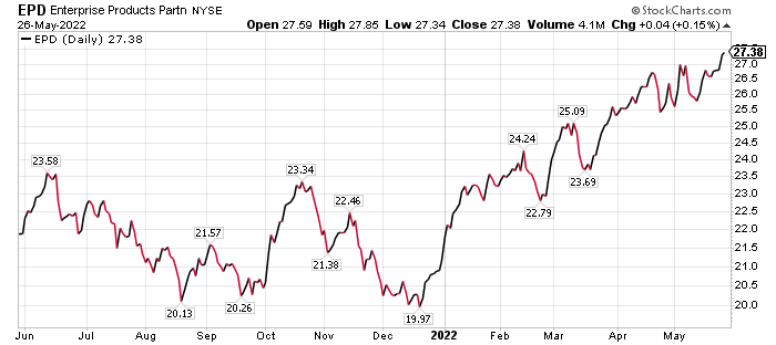 Oil has done much better lately as an inflation hedge than gold, said Mark Skousen, who is recommending Enterprise Products Partners (NYSE: EPD) in his Forecasts & Strategies investment newsletter. Houston-based Enterprise Products Partners has jumped more than up 28.92% year to date and ranks as the newsletter’s “best performer” so far in 2022, Skousen added.