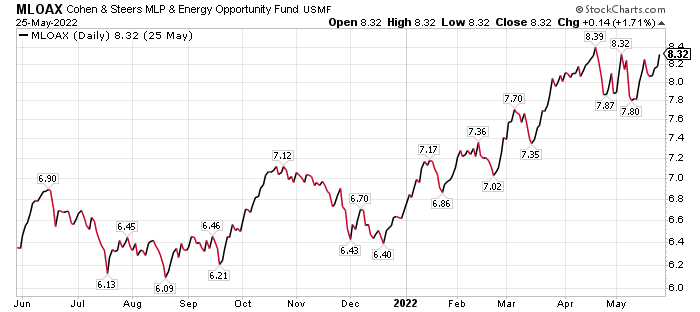 Bob Carlson, a pension fund chairman who also leads the Retirement Watch investment newsletter, currently is recommending New York’s Cohen & Steers MLP & Energy Opportunity Fund (MLOAX) in all the portfolios he detailed in his June 2022 issue.