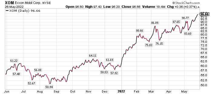Another plus is that oil prices have soared due to a combination of robust demand dynamics and constricted supply caused in part by the war between Russia and Ukraine, Skousen and Woods wrote in their May 2 issue of Fast Money Alert. With no end in sight to Russia’s ongoing invasion of adjacent Ukraine, the “smart money” is betting on higher energy prices, and the even smarter, faster money is betting on XOM, they added.