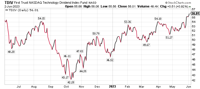 A broader-based fund with a higher dividend yield is First Trust NASDAQ Technology Dividend Index (TDIV). The ETF tries to track the Nasdaq Technology Dividend Index, which is composed of technology and telecommunications companies.