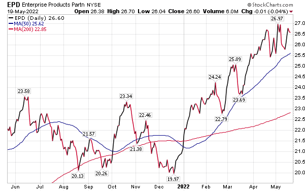 I bought shares in Enterprise Products Partners shortly after the 2020 stock market crash when the stock began to rebound after the initial shock of the COVID-19 pandemic. At the market’s close on May 19, the stock had gained 2.78% for the past week, 1.29% for the last month, 15.26% for the past three months, 25.41% so far in 2022 and 18.95% for the last year.