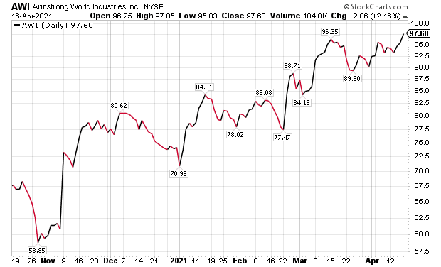 Lancaster, Pennsylvania-based Armstrong World Industries, Inc. (NYSE:AWI), a designer and manufacturer of walls and ceilings, has a global manufacturing network of 26 facilities and a modest $98 price objective on it from BoA. AWI’s 2021 estimated P/E multiple of roughly 24x also is within the dividend-paying company’s historical valuation ranges since spinning off Armstrong Flooring in April 2016.